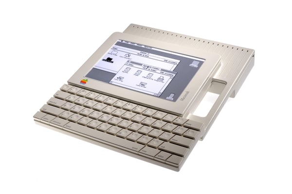Diese Studie zeigt das MacBook 1, wie die Designer es sich 1982 vorstellten. Es erscheint aus heutiger Sicht als ein ziemlich dicker Brummer - im Vergleich zu anderen tragbaren Computern der Achtziger ist es aber schon ein zartes Pflänzchen.