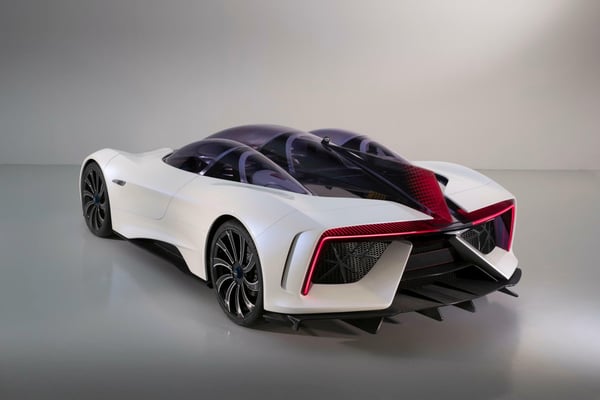 In der stärksten Ausführung soll der Stromer mit Hilfe von gleich sechs E-Maschinen 960 kW/1305 PS und 7800 Newtonmeter in den Vortrieb werfen. Dank dieser Kraft sprintet der 1,7-Tonner in 2,5 Sekunden auf 100 km/h und erreicht maximal 320 km/h.