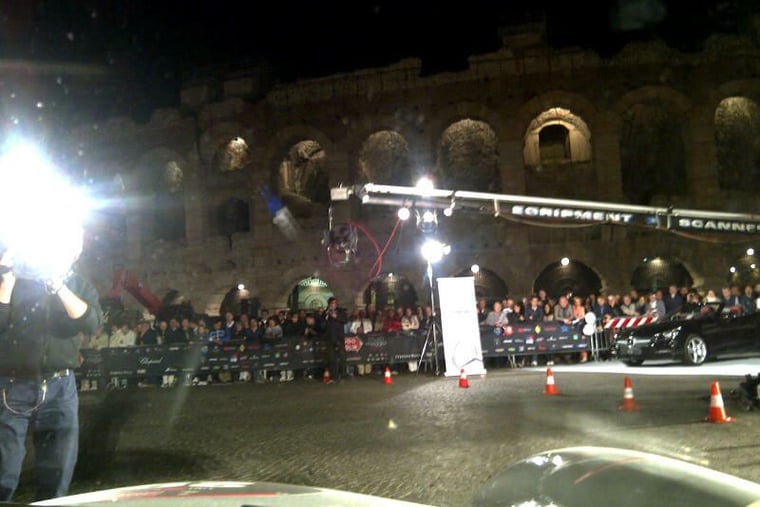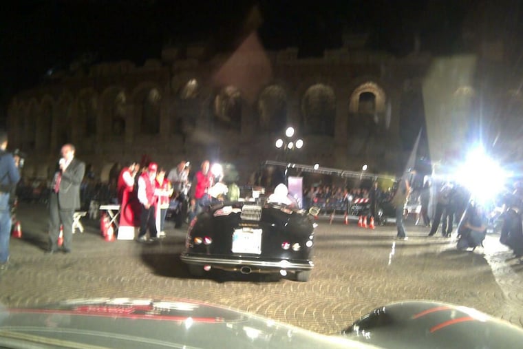 ++Donnerstagnacht: Es ist Nacht, wir heulen durch Verona, Altstadt, die Arena. Überall jubeln die Menschen. In jeder Stadt fährt die Route auf eine Bühne, der Bürgermeister reicht Geschenke ins Auto, viel Glück. Du bist Held für Sekunden, Damen mit onduliertem Haar und Perlenkette applaudieren in die zarten Hände, Mädchen kreischen, Jungs laufen hinterher. Forza forza! Kann ich mir nicht vorstellen in Deutschland. Würde sicherlich die grünen Ortsvorsteher auf den Plan rufen, schließlich verpesten wir die Luft, Kat war 30 Jahre später, Spaß verboten. Hier fährst du durch einen Wald winkender Arme, hast Angst, dass sich eine vors Auto wirft. Die Polizei schickt Streifen auf BMWs, aber sie bremsen den Pulk nicht, sondern überholen den Feierabendverkehr, hauen den Fiats mit der Faust aufs Dach damit sie den Weg freimachen für die alten Boliden. Kein Zucken, wenn du bei Tempo 50 die policia stradale, die 80 fährt, mit röchelnden Hundert überholst, bei rot die Kreuzung schneidest.