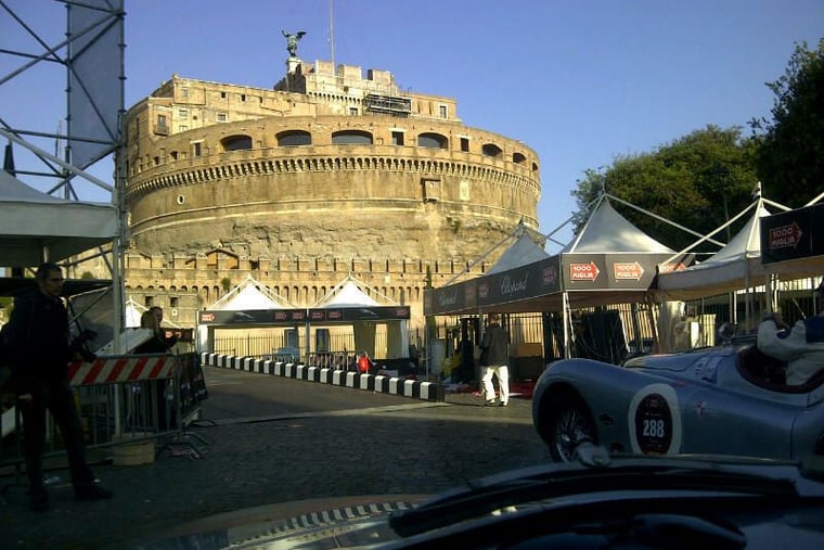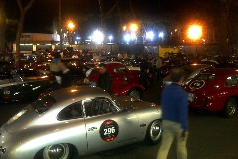 ++Donnerstag, 20 Uhr: Aufmarsch der Autos mit Flügel: Daimler hat ein Dutzend Flügeltürer am Start, den SL 300, das klassische Rennfahrzeug auf der Mille und den Straßenrennen in den 50ern. Daimler-CEO Dieter Zetsche fährt einen noblen Schwarzen. Rund 150 Mitarbeiter stützen die Flotille. Für Daimler ist es eine gigantische Werbeveranstaltung für den neuen SL. Im Startfeld knubbeln sich die 380 Teilnehmer bunt durcheinander. Deutsche erkennt man daran, dass sie irgendwie versuchen ,die Reihenfolge der Startnummern zu organisieren, Italiener drängeln sich vor und blockieren, Engländer warten stoisch trotz Rückstand von 100 Nummern, bis sich das Feld klärt. Dann 20.23 Uhr, unsere Startzeit. Pilot Bode drückt den Stempel auf das Blech, ich die Knöpfchen für den Tripmaster, der Streckenzähler. Der 356er heult, die mechanische Uhr klappert. Los geht's durch eng gesäumte Strassen, die Menschen jubeln, schreien, wollen uns anfassen, durchs Fenster, werfen Kuchen hinein. Wir sind Helden der Rennstrecke, und stehen immer wieder im Stau.