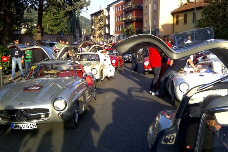 Aufmarsch der Autos mit Flügel: Daimler hat ein Dutzend Flügeltürer am Start, den SL 300, das klassische Rennfahrzeug auf der Mille und den Straßenrennen in den 50ern.