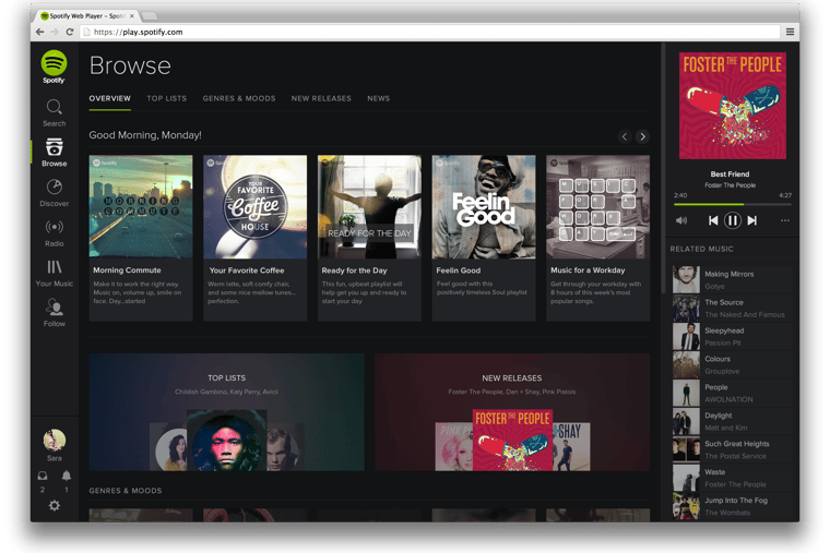 Die seit März 2012 existierende Plattform Spotify bietet mehr als 30 Millionen Songs an. Eine Gratis-Version erlaubt das Anhören der Musik mit Werbeunterbrechungen. Zusätzliche Premiumfunktionen wie das Downloaden von Liedern sind wie bei den meisten Streaming-Angeboten kostenpflichtig. Nach eigenen Angaben hat Spotify mehr als 75 Millionen Nutzer, 20 Millionen von ihnen zahlen. Der Streaming-Dienst ist in 58 Ländern verfügbar.