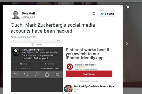 Beim Foto-Dienst Pinterest gelang es den Hackern mithilfe des Passworts, das sie nach eigener Auskunft in den gestohlenen des Karriere-Netzwerks LinkedIn gefunden haben, den Profiltext für kurze Zeit durch den Text „gehackt vom OurMine Team“ zu ersetzen. Bei Twitter gab es eine verdächtige Aktivität auf Zuckerbergs Account mit dem Namen „@finkd“, in dem er seit Januar 2012 nichts mehr veröffentlicht hatte. Und bei Pinterest wurde das angebliche Passwort sogar öffentlich gemacht: "dadada".