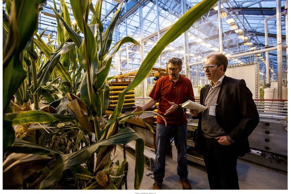 Monsanto-Manager Ed Fischer erklärt die nächsten Versuche. Künftig sollen die Monsanto-Manager noch enger zusammenarbeiten. Über eine Brücke sind die Gewächshäuser mit den Laborräumen verbunden.