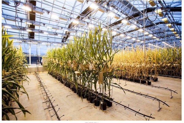 Jedes einzelne Gewächshaus ist ungefähr so groß wie ein Handballfeld. Hier werden unter anderem neue Pflanzenschutzmittel für Mais getestet. Licht, Temperatur und Belüftung können variiert werden.