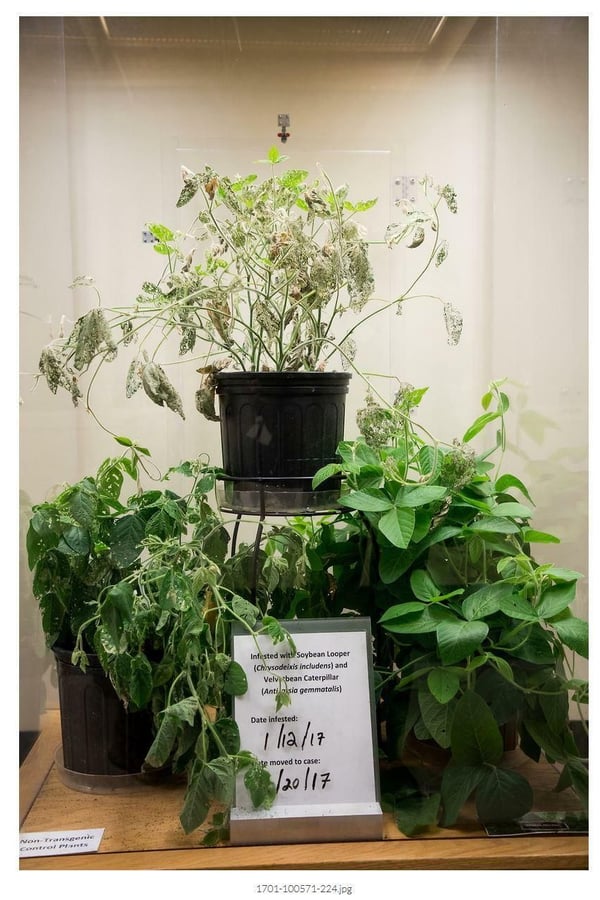 Um Schadinsekten zu töten, schleusen die Monsanto-Forscher in Sojapflanzen entsprechende Proteine ein. Die Sojapflanze ganz oben wurde allerdings nicht mit einem Protein behandelt, die Insekten hatten leichtes Spiel.