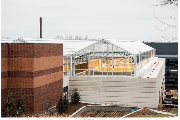 Um Platz zu sparen, hat Monsanto 36 neue Gewächshäuser auf dem Dach seines Forschungszentrums errichtet. Die Einweihung war im November. Nachts leuchten die Gewächshäuser im Dunkeln.