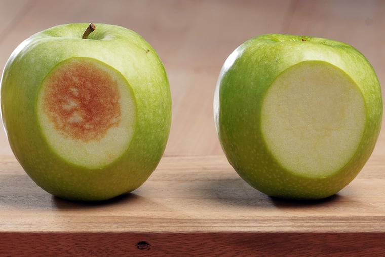 Ein Zaun gegen Rehe und Hirsche ist der einzige Schutz, den Obstbauer Neal Carter für seine drei Plantagen im US-Bundesstaat Washington braucht. Seine Äpfel unterscheiden sich äußerlich nicht von allen anderen, die in diesem riesigen Anbaugebiet nahe des Vulkans Mount Rainier wachsen. So können Umweltschützer sie nur schwer aufspüren. Das Besondere an Carters Arctic Apple zeigt sich, wenn man ihn aufschneidet: Das Fruchtfleisch färbt sich nicht braun. Carter muss seine Äpfel daher nicht aufwendig behandeln, bevor er sie in mundgerechte Stücke schneiden lässt und abgepackt in Plastiktüten verkauft – so wie konkurrierende Anbieter.