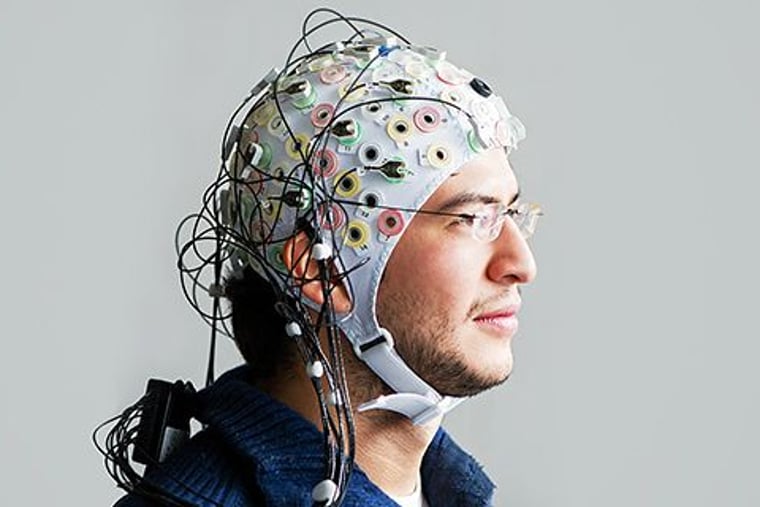 Die Anwendungen funktionieren alle ähnlich. Fühler in einer Haube auf dem Kopf messen die Spannungsschwankungen von Milliarden elektrisch aktiver Neuronen im Hirn. Die verstärkten Signale ergeben ein Elektroenzephalogramm (EEG). Es genügt schon, sich nur vorzustellen, den Arm zu bewegen, um die Nervenzellen in der Kommandozentrale für Bewegungen zu aktivieren. Ein Rechner übersetzt das Signalmuster in Steuerbefehle. Im Fall von Leusing: Ball hoch oder runter.