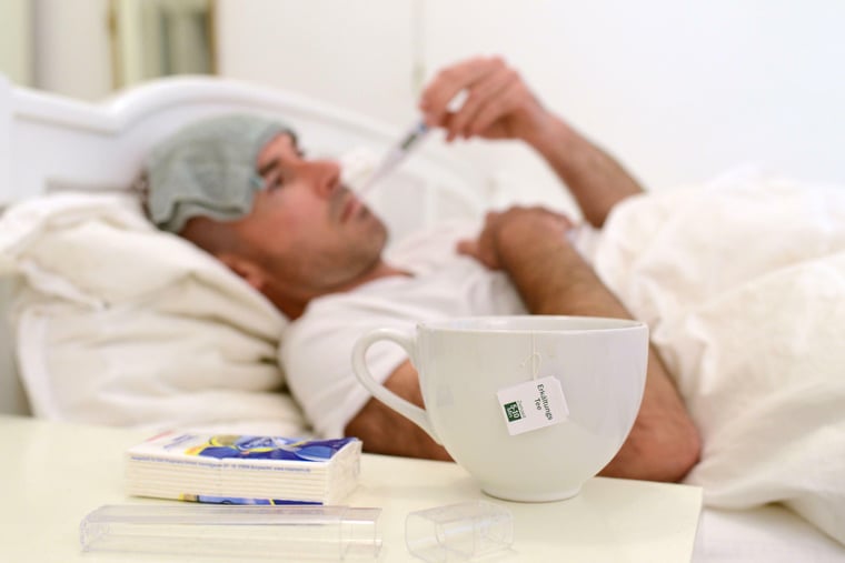 Ein kranker Mann lieg im Bett und misst Fieber.