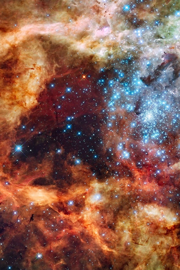 Eine Gruppierung junger Sterne - gerade mal ein paar Millionen Jahre alt - ist hier im Sternbild Schwertfisch zu sehen. Dabei handelt es sich um eine turbulente Region in der Großen Magellanschen Wolke, in der zahlreiche Sterne geboren werden. Die große und kleine Magellansche Wolke sind Sternensysteme, die die Milchstraße umkreisen. Die große Magellansche Wolke ist etwa 180.000 Lichtjahre entfernt. Ihren Namen haben sie von Ferdinand Magellan, der 1519 die Passage zwischen Südamerika und Feuerland fand, heute als Magellan-Straße bekannt. Im Tagebuch eines seiner Begleiter werden zwei helle Wolken am südlichen Sternhimmel beschrieben - die Magellanschen Wolken.