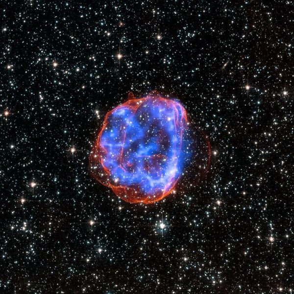 Dieses Bild zeigt die Staubwolke SNR 0519-69.0. Dabei handelt es sich um eine heiße, sich ausbreitende Wolke mit den Überresten einer Sternexplosion. Lokalisiert ist das Spektakel in der Großen Magellanschen Wolke in rund 170.000 Lichtjahren Entfernung.