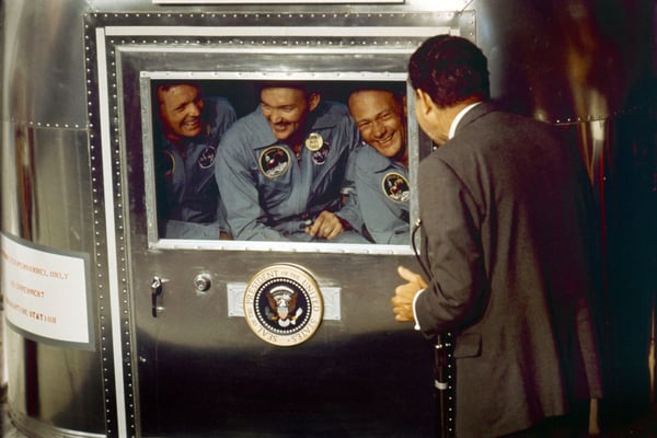 Die Mission hielt die Öffentlichkeit in Atem. Nach dem Abflug besuchte der damalige US-Präsident Richard Nixon die Astronauten Neil Armstrong, Michael Collins und Edwin Aldrin (von links). Die Astronauten befanden sich nach ihrer Rückkehr vom Mond für einige Tage in Quarantäne.