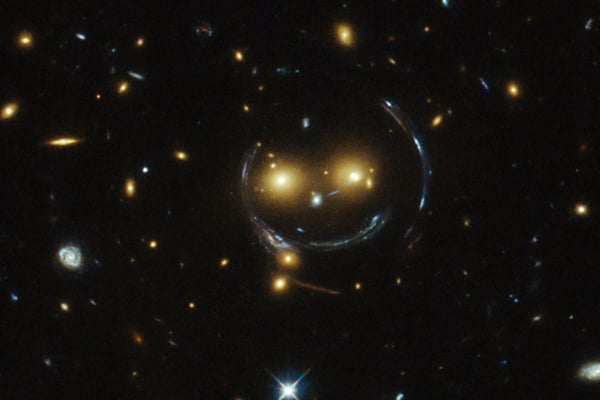 Der Galaxienhaufen SDSS J1038+4849 scheint den Betrachter anzulächeln: Man kann zwei orangefarbene Augen und eine weiße Nase ausmachen. Bei den Augen handelt es sich um zwei besonders helle Galaxien. Die Linie, die als Lächeln erscheint, entsteht durch den sogenannten Gravitationslinseneffekt: