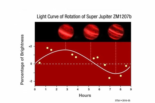 Zum ersten Mal konnten Wissenschaftler nun bei einem sogenannten Exoplaneten die Rotation anhand von Bildern beobachten und messen. Durch Veränderungen der Helligkeit der Aufnahmen durch die Rotation des Planeten konnten sie berechnen, dass sich der Super-Jupiter zwei Mal so schnell wie die Erde dreht: Einmal in etwa zehn Stunden legt er eine komplette Drehung hin und rotiert damit ähnlich schnell wie der Jupiter.