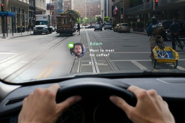 Das durchsichtige Display Navdy vom gleichnamigen US-Hersteller zeigt Routeninfos, Textnachrichten oder Musiktitel an. Es wirkt, als schwebten die Informationen über der Straße.