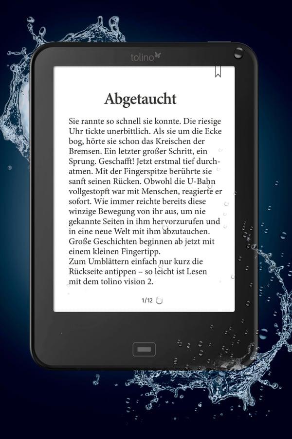 Endlich mit dem E-Buch in die Wanne: Der wasserdichte und beleuchtete E-Reader Tolino Vision 2 der Deutschen Telekom überlebt auch Tauchgänge. Er bietet Zugriff auf über eine Million Bücher.