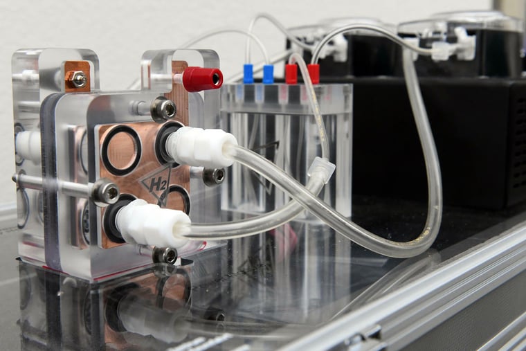 Auf dem Tisch steht eine Flüssigbatterie. Wie in einer handelsüblichen Batterie bewegen sich darin Ionen - elektrisch geladene Teilchen - von einem Pol zum anderen. Der Unterschied: Die Einheit, in der Strom über Membranen in die Batterie hinein- und aus ihr herausfließt, ist vom Speichermedium getrennt. Damit gibt es keine Größenbeschränkung für den Speicher - nur die Dimension des Salzstocks.