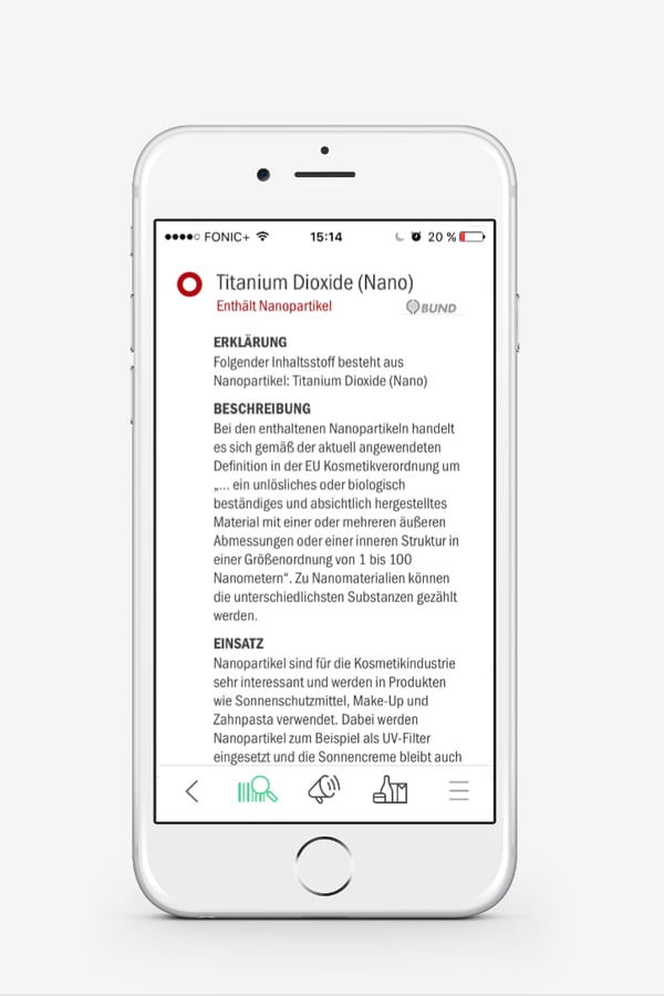 Nicht einfach für den Verbraucher, wenn er auf Nanotechnologie verzichten will. Abhilfe schafft nun eine über eine kostenlose App des Produktratgebers Codecheck. Damit können ganz einfach Produkte mit Nanopartikel ermittelt werden. Über die Fotofunktion wird das Produkt eingescannt und auf die gesuchten Inhaltsstoffe hin erkannt. Gemeinsam mit dem BUND will Codecheck Konsumenten die Chance zu einem bewussten Kauf geben. „Transparenz bei der Anwendung von Nanopartikeln in Verbraucherprodukten ist ein absolutes Muss, denn immer noch wissen wir zu wenig über die langfristigen Wirkungen der Partikel auf Mensch und Umwelt", so Dr. Rolf Buschmann, Referent für technischen Umweltschutz beim BUND.