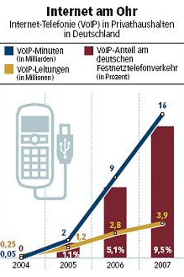 Moores digitaler Raubzug ist nur der bisher schwerwiegendste aufgedeckte Fall. Er wirft einen dunklen Schatten auf einen der heißesten Trends in der Telekommunikation: Die Ablösung der klassischen Telefonnetze durch das Internet. Gelockt durch günstigere Tarife und mehr Komfort telefoniert eine stetig wachsende Kundenzahl inzwischen via Web – im Expertenjargon Voice over Internet-Protocol (VoIP) genannt. Weltweit investieren Telefongesellschaften und Internet-Anbieter Milliardensummen, um ihre Netze für die digitalen Sprachdienste fit zu machen.