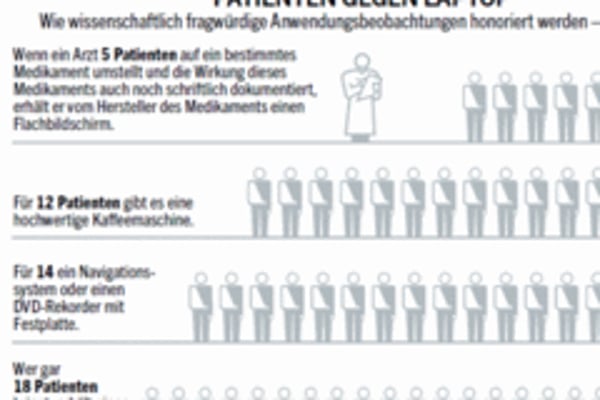 Die Ärzte füllen dafür sogenannte Anwendungsbeobachtungen aus. Auf den Fragebögen der Pharmakonzerne vermerken sie, wie sich die Pillen im Körper der Kranken bemerkbar machen, ob und welche Nebenwirkungen auftreten. Grundsätzlich eine sinnvolle Sache. Nur: Oft werden die Anwendungsbeobachtungen bloß als Vorwand missbraucht, um den Ärzten Geld zukommen zu lassen. Zuweilen müssten die Ärzte nur ein Beobachtungsformular blanko unterschreiben, heißt es in der Branche.