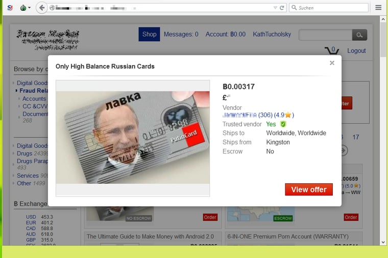 „Das sind die Kleinkriminellen der Cyberwelt“, sagt Achten. Leidtragende sind in solchen Fällen meist Privatpersonen, nicht das Unternehmen selbst. Geht man noch eine Stufe tiefer in die Welt der Cyberkriminalität, findet man Trojaner, Viren und Malware, die der Kunde sich einfach in seinen Warenkorb packen kann. Die Verkäufer legen viel Wert auf ein gutes Dienstleistungsverhältnis: Sie werben mit ihrer Erfahrung und den Berichten früherer Abnehmer. Kunden können ihre Verkäufer ähnlich wie bei Ebay oder Amazon bewerten.
