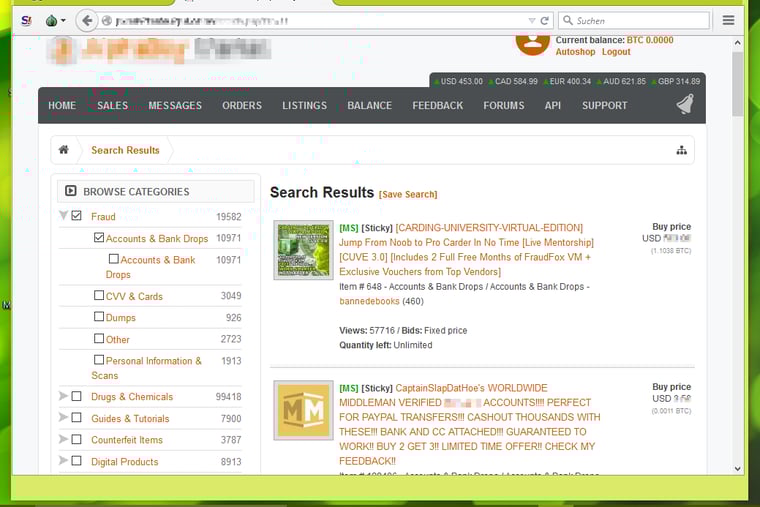 Die Plattformen heißen „The Real Deal“, „Hansa“ oder „Dream Market“. Auf jedem dieser Darknet-Märkte finden sich tausende lukrative Angebote. Zum Beispiel bekommt man dort für 140 Dollar ein Paypal-Konto mit bis zu 1000 Dollar garantiertem Volumen, eine Kreditkarte der Firma Master Card für 17 Dollar oder Bankkonten mit einem Dispo von 70.000 Dollar zu einem Preis von 4200 Dollar.