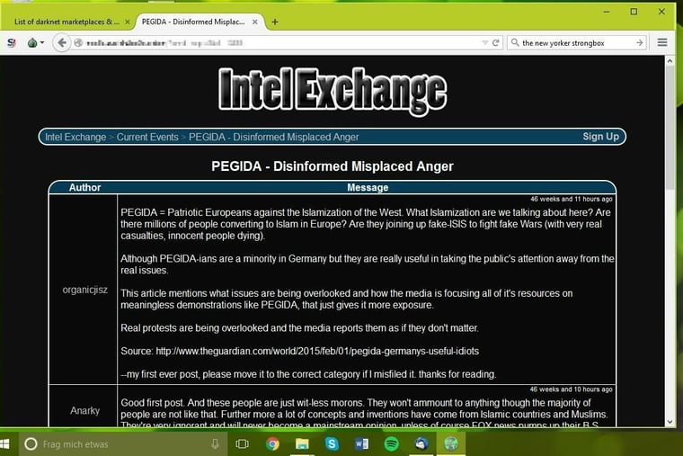 Weitaus unbekannter ist der ziemlich profane Teil des anonymisierten Netzes. Essay-Seiten, in denen User frei ihre Gedanken niederschreiben, aber auch krude Blogs über Verschwörungstheorien. Es gibt Foren, in denen über Politik gesprochen wird, und welche, in denen Hack-Angriffe für "gute Zwecke" geplant werden. In den Untiefen des anonymen Internets findet sich dann sogar ein Forumseintrag über Pegida, oder besser gesagt gegen das deutsche Antiislam-Bündnisses.