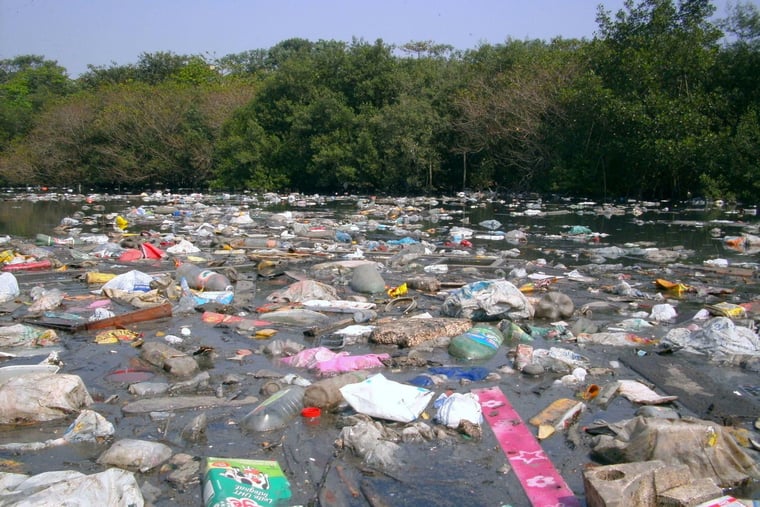 Abfallverschmutzung im Mündungsgebiet bei Santos, São Paulo, Brasilien.