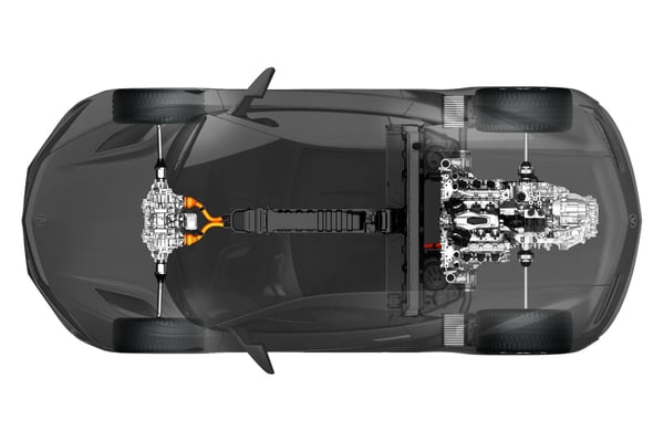Im Zentrum steht der komplett neu entwickelte Antriebsstrang: Der exklusiv für den NSX gebaute 3,5-Liter-Sechszylinder mit 75 Grad Zylinderbankwinkel bringt es dank zweier Turbolader auf 507 PS. Dabei wird er von einem Elektromotor mit 48 PS direkt unterstützt. Der bringt die kombinierte Kraft auf die Hinterachse. An der Vorderachse sind zwei weitere Elektromotoren mit je 37 PS verbaut, was die Systemleistung auf stolze 581 PS (646 Newtonmeter Drehmoment) hochschraubt. Die Hauptaufgabe der beiden vorderen E-Maschinen ist aber nicht der reine Vortrieb, sondern eine Innovation, die seit einigen Jahren die Sportwagen-Szene umtreibt: das Torque Vectoring.