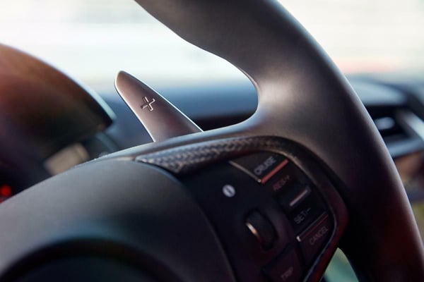 Der erste NSX wurde nur auf besondere Nachfrage mit einem Automatikgetriebe gebaut. Bei dem Neuen gibt es keine Alternative mehr: Er wird ausschließlich mit einem Doppelkupplungsgetriebe mit neun Gängen angeboten. Die Schaltpaddles am Lenkrad fühlen sich allerdings nach sehr preiswertem Kunststoff an. Stört aber auch nicht weiter, weil der Fahrer die Paddles eigentlich nicht braucht. Im Gegensatz zu vielen anderen Sportwagen, die bei schnellerer Gangart besser manuell geschaltet werden, hatte der NSX bei den ersten Testfahrten immer den passenden Gang parat – auf der Rennstrecke wie auf der Landstraße.
