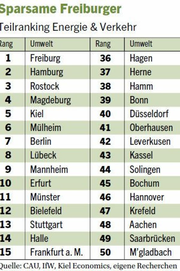 Dieses Engagement beschert Freiburg im Nachhaltigkeitsranking erste Plätze in gleich drei Kategorien, darunter im Themenfeld Energie & Verkehr. Die 225 000 Einwohner "profitieren vor allem von den Anstrengungen in Sachen Energieeffizienz", sagt Jonas Dovern von dem Beratungsunternehmen Kiel Economics. Die Freiburger verbrauchen pro Kopf mit 1718 Kilowattstunden im Jahr weniger Strom als die Bürger der meisten anderen Städte.