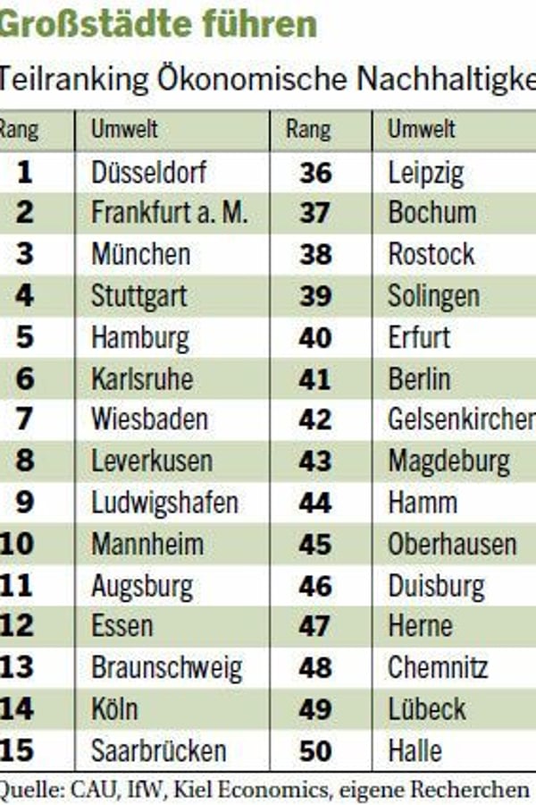 Sieger der Kategorie ist Düsseldorf. Die nordrhein-westfälische Hauptstadt liefert Bestwerte bei fast allen Aspekten ökonomischer Nachhaltigkeit: Rang eins bei Produktivität, Platz zwei bei der Pro-Kopf-Wirtschaftsleistung mit 72 000 Euro – und ein erster Rang bei den öffentlichen Finanzen: Obwohl die 590 000-Einwohner-Stadt von Pleitekandidaten umstellt ist, wirtschaften die Düsseldorfer seit 2007 praktisch schuldenfrei. Doch so erfolgreich sich die Stadt um solide Finanzen bemüht, so sehr hapert es in den Kategorien Umwelt, Energie und Soziale Nachhaltigkeit. Hier reicht es nur für mittelmäßige Werte und Platz 13 im Gesamtranking.