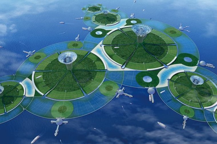 Es könnte ein Entwurf des US-Verpackungskünstlers Christo sein. Tatsächlich haben sich japanische Architekten der Shimizu Corporation diese überdimensionale Seerosenstadt ausgedacht – mit kompletter Infrastruktur und üppiger Vegetation. In der Südsee auf der Höhe des Äquators soll die klimafreundliche, selbstversorgende Trauminsel schwimmen. Dort gibt es viel Sonne und kaum Taifune. Das Fundament soll aus wabenförmigen, mit Wasser und Luft gefüllten Betonröhren bestehen, um so der Insel Auftrieb und Stabilität zu verschaffen. Die Technik haben die Japaner bereits bei schwimmenden Bohrinseln erprobt. Jede ihrer sogenannten grünen Flossen hat einen Durchmesser von drei Kilometern und einen Hauptwohnbezirk mit einem kelchartigen, 1000 Meter hohen Wohn- und Arbeitsturm, in und um den herum 40.000 Menschen wohnen sollen. 350 Hektar Nutzfläche bleiben den Bewohner, um ihre Lebensmittel zu produzieren. Baubeginn soll 2050 sein.