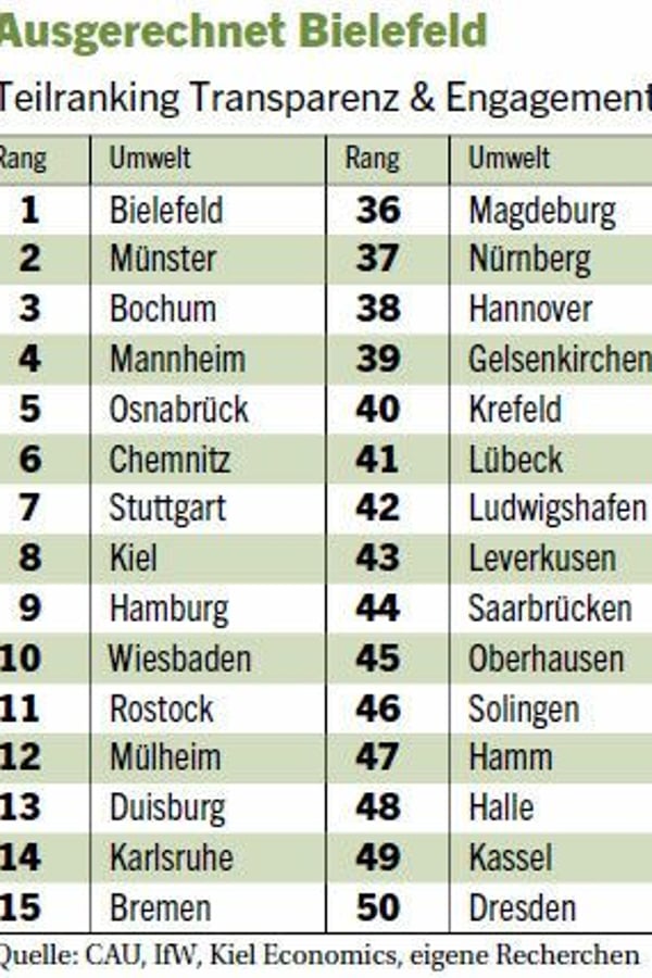 Auch wenn in Internet-Foren die Existenz Bielefelds scherzhaft angezweifelt wird: Im Nachhaltigkeitsranking führt ausgerechnet diese Stadt die Kategorie Transparenz & Engagement an. Dieser Indikator ist wichtig, um die Städte miteinander vergleichen zu können. Denn die Nachhaltigkeit von Kommunen lässt sich von außen nur schwer einschätzen. "Umso wichtiger ist es, dass die Verwaltungen detailliert über ihre Aktivitäten informieren und vergleichbare Werte veröffentlichen", sagt IfW-Ökonom Wilfried Rickels. "Daneben bekommen Städte in dieser Kategorie Punkte, die das nachhaltige Engagement der Bürger am stärksten fördern."
