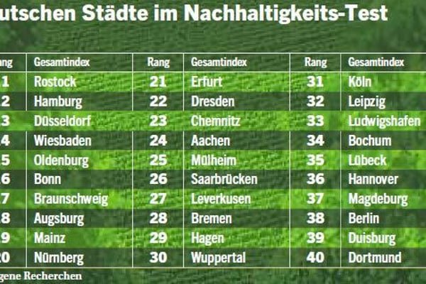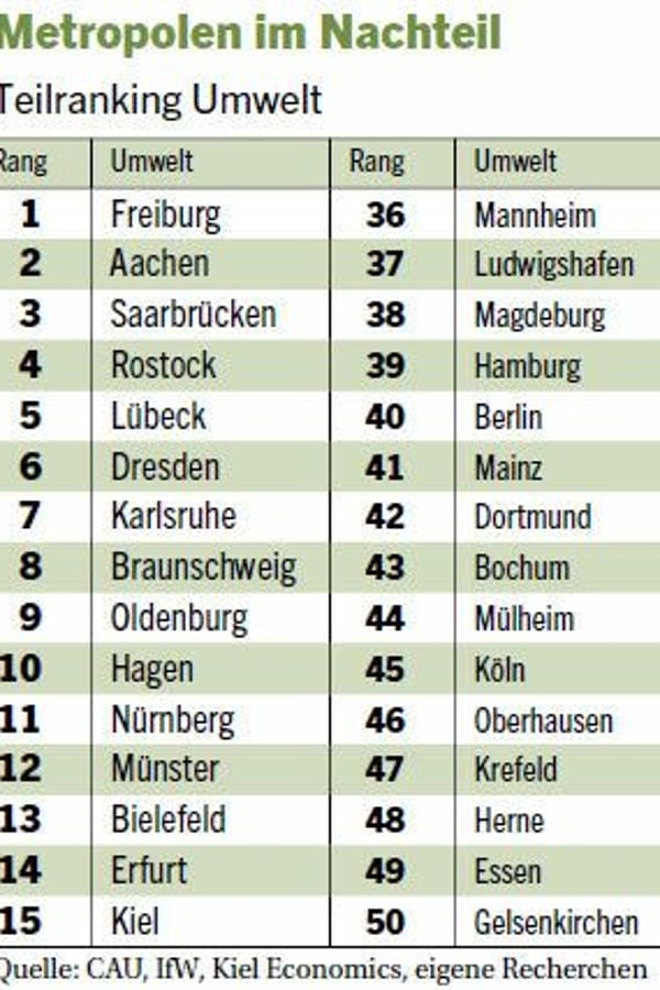 Deutschlands große Metropolen hingegen schneiden in Umweltfragen durchweg schlecht ab. Berlin landet im Ranking auf Platz 40, Hamburg belegt Rang 39, München schafft 35 und Köln 45. "Kleine Städte haben eine bessere Luftqualität, mehr naturnahe Flächen im Stadtgebiet und höhere Recyclingquoten", sagt Ökonom Dovern.