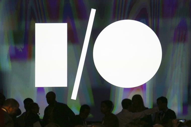 Das Google I/O-Logo leuchtet auf der Hauptbühne in San Francisco.