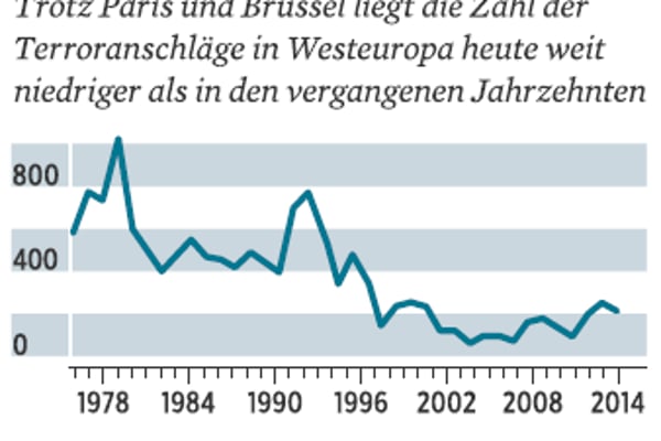 Die Zahl der Anschläge in Westeuropa ist heute niedriger als noch vor 30 Jahren (Für eine Großansicht auf das Bild klicken)