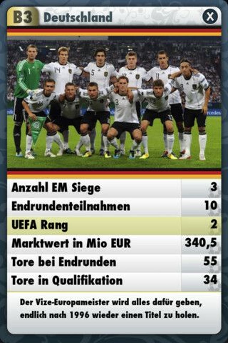 Schulhoffeeling zur Fußball-EM: Mit dem EM 2012 Quartett auf iPhone und iPod touch können Sie mit den digitalen Quartett online in sechs Kategorien gegen ihre Freunde zocken. Die App ist kostenlos.