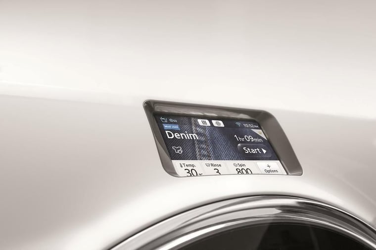 Unter dem Namen Crystal Blue zeigt Samsung seine Produktreihe intelligenter Waschmaschinen, die ihren Status per Kurzinfo an angeschlossene Smartphones weitergibt. Ist die Maschine fertig, bekommt der Nutzer eine Nachricht. Kostenpunkt für eine Waschmaschine: rund 2000 Euro.