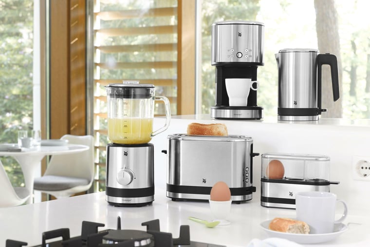 WMF verkleinert die klassischen Küchengeräte. Die Coup Frühstücksserie beinhaltet eine kleine Kaffeemaschine, einen 0,8-Liter-Wasserkocher, einen Einscheibentoaster, einen Eierkocher für zwei Eier sowie einen kleinen Kompaktmixer.