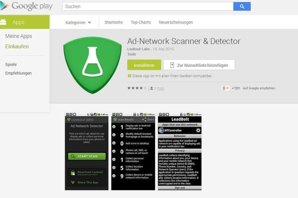 Viele App-Betreiber sind Mitglied in sogenannten Werbenetzwerken, die das Nutzungsverhalten erfassen. Der Ad Network Scanner & Detector untersucht Apps auf Komponenten von 35 Werbenetzwerken. Nach dem Scan listet die App die aktiven Werbenetze mit Informationen dazu auf, wie die Netze funktionieren und welche Daten sie sammeln. Der Vorteil: Das Programm entdeckt nicht nur Schnüffel-Apps, sondern bietet mit der Opt-Out-Funktion auch an, das Datensammeln einer App für Werbezwecke abzustellen.
