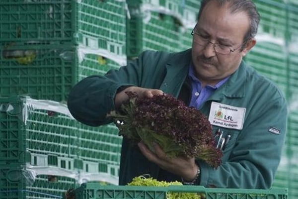 Ein Mitarbeiter eines Gemuesebetriebs prueft am Dienstag (14.06.11) in Nuernberg die Qualitat eines Salatkopfes der Sorte "Lollo Rosso". Foto: Lennart Preiss/dapd