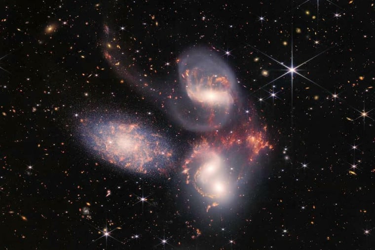 Diese Aufnahme zeigt „Stephan's Quintet“, eine Gruppe von fünf Galaxien. „Dieses riesige Mosaik ist die größte Aufnahme von Webb bislang“, wie die Nasa mitteilt. Das Bild ist aus fast 1000 Einzelaufnahmen zusammengesetzt. Es enthält über 150 Millionen Pixel. Es zeigt einen Abschnitt des Universums, der von der Erde aus gesehen etwa einem Fünftel der Fläche des Mondes entspricht. Es sind unter anderem funkelnde Cluster aus Millionen junger Sterne und gerade entstehender Sterne zu sehen. Dieses riesige Mosaik ist das bisher größte Bild vom Weltraumteleskop James Webb und bedeckt etwa ein Fünftel des Monddurchmessers.