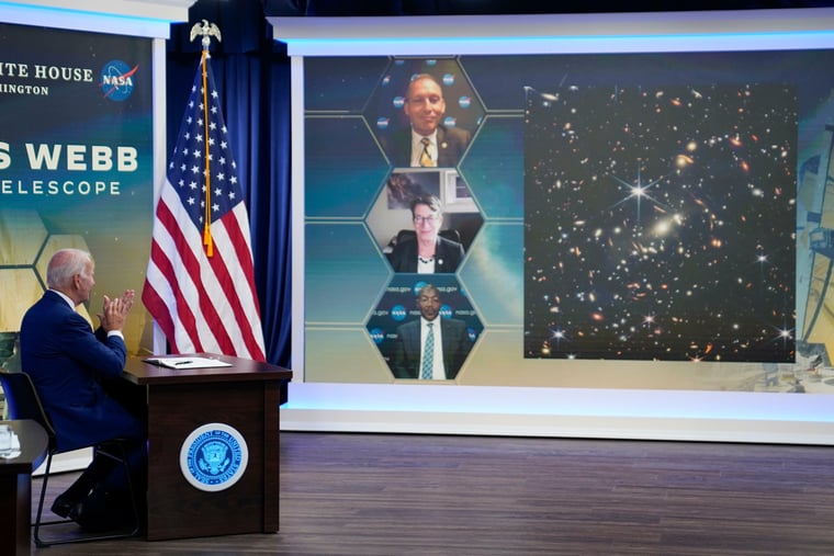 Auch der amerikanische Präsident Joe Biden (links im Bild) ließ sich die Chance nicht nehmen, die einzigartige Aufnahme mit den Nasa-Funktionären aus dem Weißen Haus heraus der Welt zu präsentieren. Nach Angaben der Nasa ist es die „tiefste und schärfste bislang aufgenommene Infrarot-Sicht auf das Universum“.