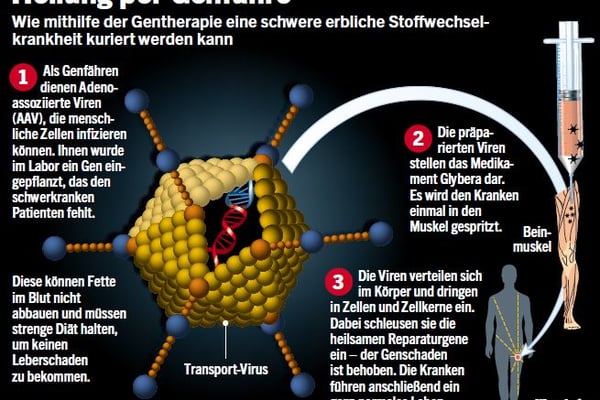 Ginge es nur nach der Zahl der Menschen, denen die neue Therapie des niederländischen Biotech-Unternehmens UniQure hilft, würden darüber ausschließlich medizinische Fachblätter berichten: Lediglich ein bis zwei Fälle der Krankheit mit dem unaussprechlichen Namen Lipoproteinlipase-Defizienz (LPLD) werden bei einer Million Menschen beobachtet. Gegen diese sehr seltene, erblich bedingte Fettstoffwechselkrankheit hat UniQure nun eine Therapie namens Glybera entwickelt. Die europäische Arzneimittelbehörde EMA lässt sie gerade zu. Was die Therapie so einzigartig macht: UniQure heilt mithilfe von Genen, die Transport-Viren in den Körper der Kranken einschleusen. Nach über 25 Jahren Forschung mit zahllosen Rückschlägen und sogar Todesfällen ist dies die erste Gentherapie, die ein westliches Land gestattet. Fünf Gründe, weshalb sich jeder für diese neue Therapie interessieren sollte: