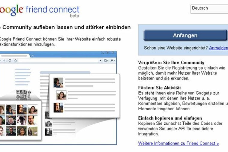 Friend Connect startete Google 2008 und wollte damit Facebook paroli bieten. Analog zu Mark Zuckerbergs Facebook Connect soll damit der sogenannte soziale Graph von Personen, also Informationen über dessen Freunde, Vorlieben etc. übergreifend im gesamten Internet genutzt werden. Wer sich also auf einer beliebigen Seite, die den Dienst nutzt, mit seinen Google-Kontodaten einloggt, kann sehen, welche anderen Kontakte sich dort ebenfalls tummeln. Google stellte Websitebetreibern dazu eine Art Social-Media-Baukasten zur Verfügung. Dieser Service wird im März 2012 eingestellt, stattdessen sollen über das Netzwerk Google+ ähnliche Verknüpfungen erfolgen.