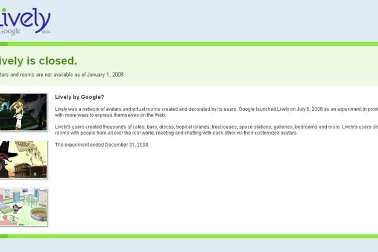 Als der Hype um virtuelle Welten wie Second Life noch groß war, startete Google "Lively". Damit konnten Avatare geschaffen werden und Räume in denen man sich treffen konnte. Resonanz und Halbwertzeit waren dürftig: nach nicht einmal sechs Monaten wurden die neuen Tummelplätze wieder geschlossen.