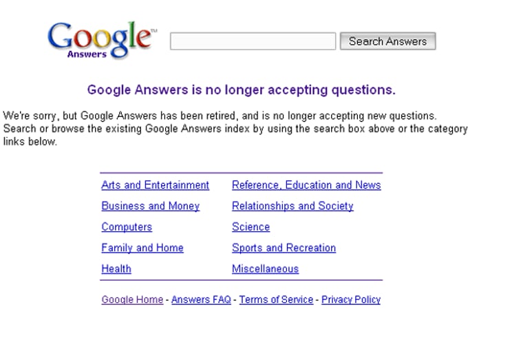 Auch in seiner eigentlichen Domäne, der Suche läuft nicht immer alles nach Plan. Mit "Google Answers" konnten Nutzer ihre Anfragen von einem professionellen Suchteam gegen Gebühr bearbeiten lassen. 2006 wurde das Projekt beendet.