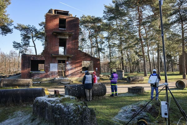 Roboter Smurf ist dabei nur ein Element von vielen im digitalen Werkzeugkasten. Parallel schweben bei der Demonstration am Niederrhein verschiedene Drohnen über den simulierten Schuttbergen. Unterdessen befestigen Rettungskräfte spezielle Sensoren, sogenannte Geophone, an einzelnen, mannsgroßen Betonblöcken, die sich auf dem Übungsplatz neben baufällig wirkenden Gebäuderesten türmen.